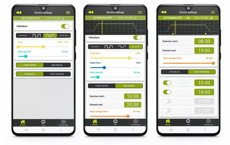 Ultramax BT filtras leidžia valdyti srauto galią taip, kaip atvirose vandens telkiniuose, kur naktinis bangavimas skiriasi nuo dieninio. Pakanka nustatyti valandas, kuriomis filtro veikimas turi sulėtėti – taip atkuriamas naktinis režimas.